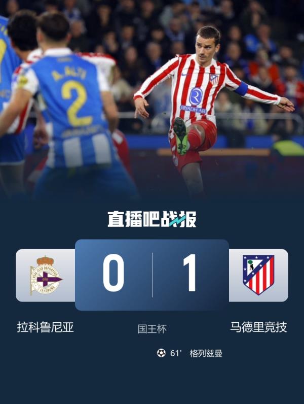 国王杯第4轮,马竞客场1-0战胜拉科鲁尼亚,格列兹曼任意球制胜。